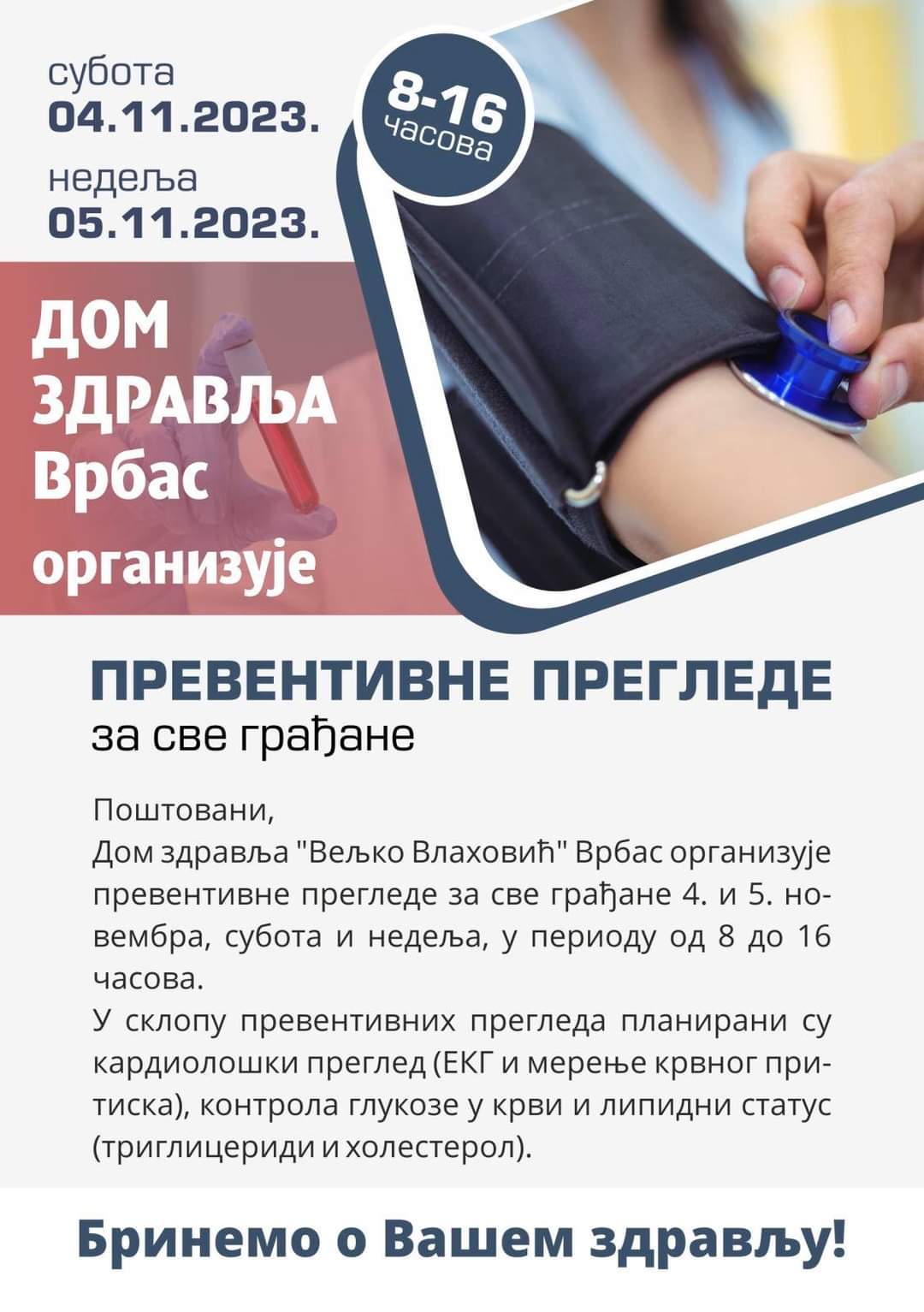 Дом здравља "Вељко Влаховић" Врбас организује превентивне прегледе за све грађане 4. и 5. новембра, субота и недеља, у периоду од 8 до 16 часова. У склопу превентивних прегледа планирани су кардиолошки преглед (ЕКГ и мерење крвног притиска), контрола глукозе у крви и липидни статус (триглицериди и холестерол).